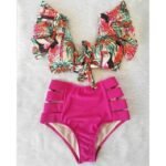 Stylish and bright coloring. Up swimsuit is colored, in bright flowers. In the chest area there are lining. Behind the top is adjusted by strings.