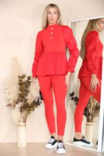 Long Ruched Sleeves Ribbed Peplum Diamond Buttons Frilled Hem Lounge Wear Co-Ord Set