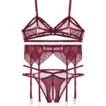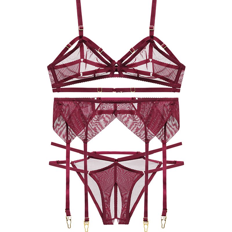 The product contains: bra + panties + garter clip, three-piece suit